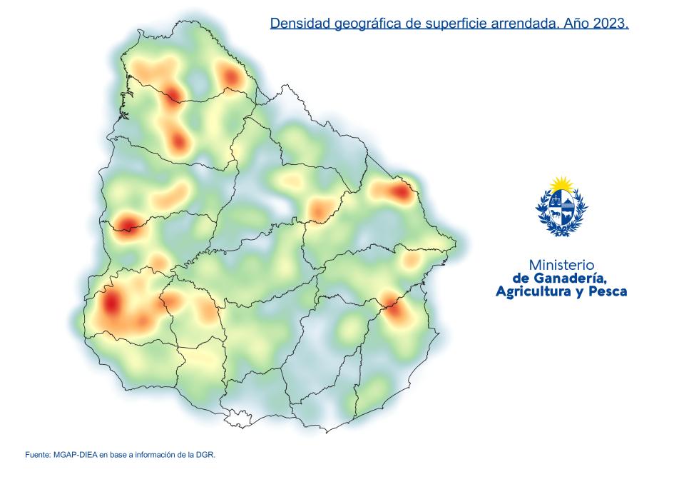 Los departamentos con más superficie arrendada fueron, por su orden, Artigas, Salto y Soriano; sumando un área de 224.993 hectáreas (29% del arrendamiento del año) constituyendo el 32% del monto total. Soriano, Colonia y Río Negro fueron los departamentos con los registros de mayor precio medio de renta (U$S 312, U$S 261 y U$S 235 por hectárea en su orden). En el otro extremo, los contratos que se acordaron a menores valores correspondieron al departamento de Tacuarembó con un promedio de U$S 85/ha/año seguido por Rivera, que arrojó un precio promedio de U$S 86/ha/año. Con el propósito de mejorar la información desagregada a nivel departamental, se confeccionó un análisis de valores medios de renta para los principales rubros agropecuarios.